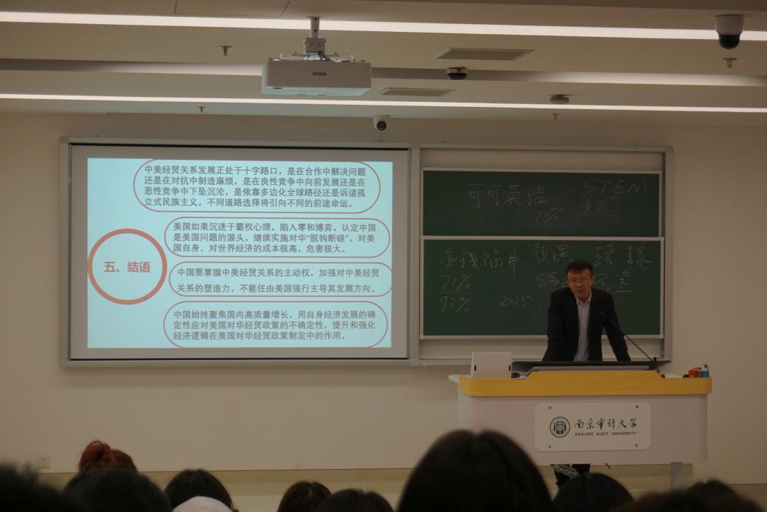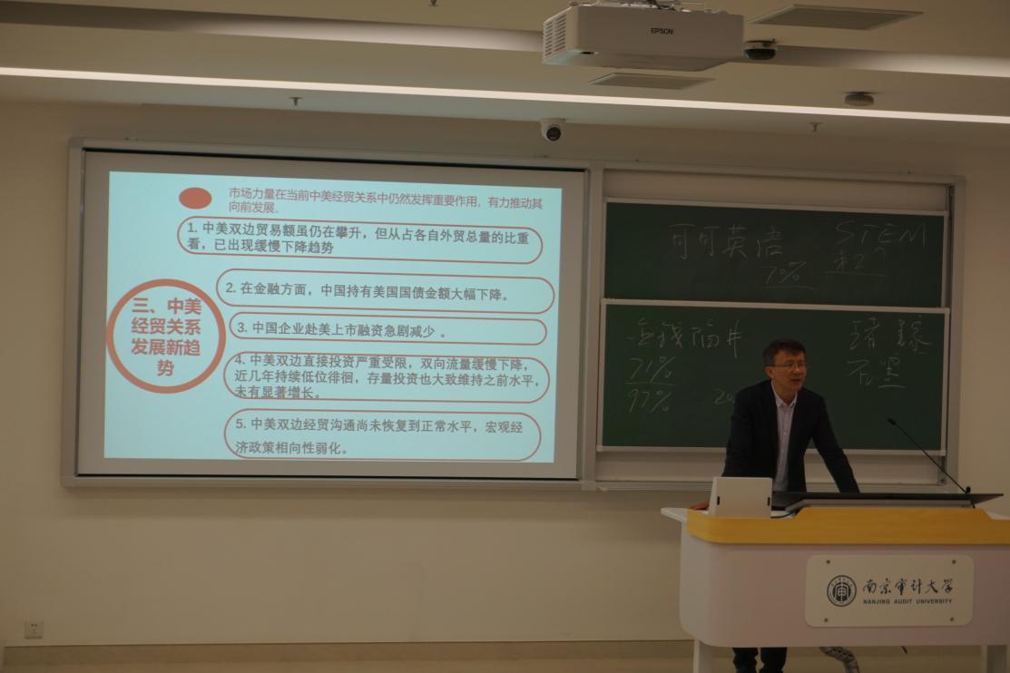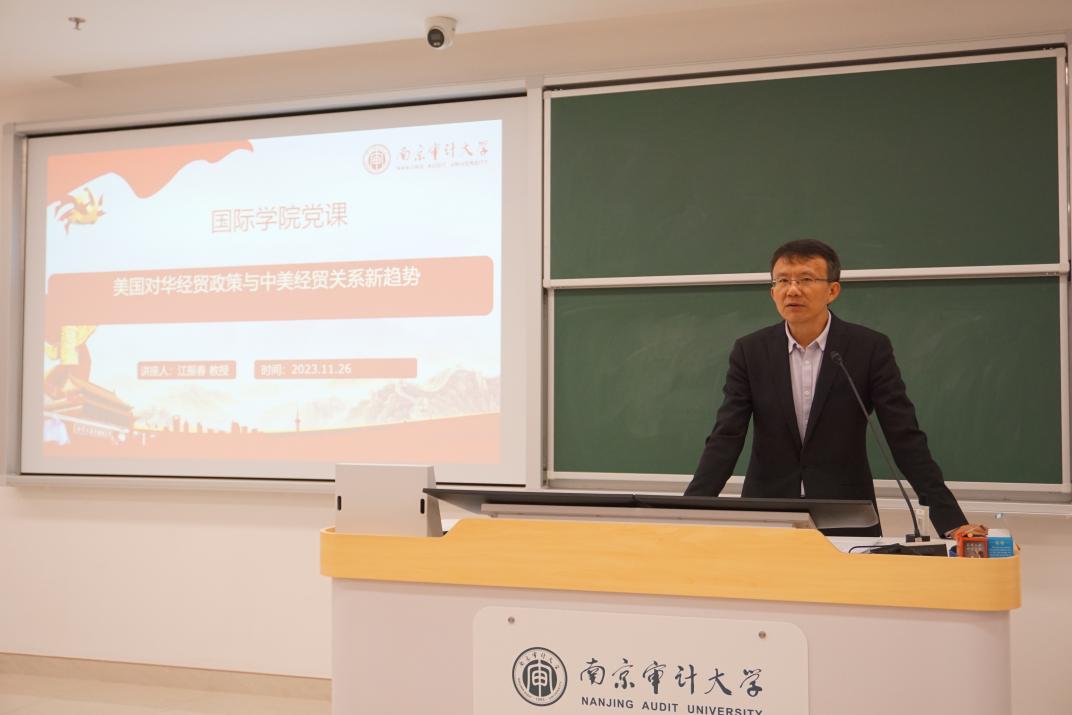 11月26日晚,学院党总支书记江振春教授在综合楼207为我院发展对象、入党积极分子、入团积极分子授课,主题为“美国对华经贸政策与中美经贸关系新趋势”。