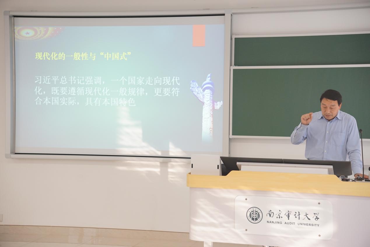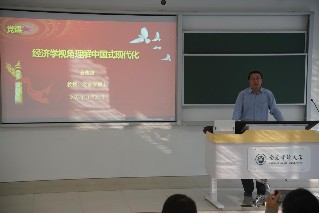 姜德波教授的党课内容包括“中国式现代化的提出”“经济现代化是中国式现代化的物质基础”“推进中国式经济现代化建设进程”等三个部分。他首先引用党的二十大报告中关于中国式现代化的论述,论证了中国式现代化是对现代化理论的一次重大突破,也为人类探索现代化道路提供了新选择,作出了新贡献。姜德波强调,中国式现代化是中国共产党领导的社会主义现代化,既有各国现代化的共同特征,更有基于自身国情的中国特色。他分析了中国式现代化与西方现代化的根本区别,并对“现代化就是西方化”“历史终结论”等错误观点进行了批判。